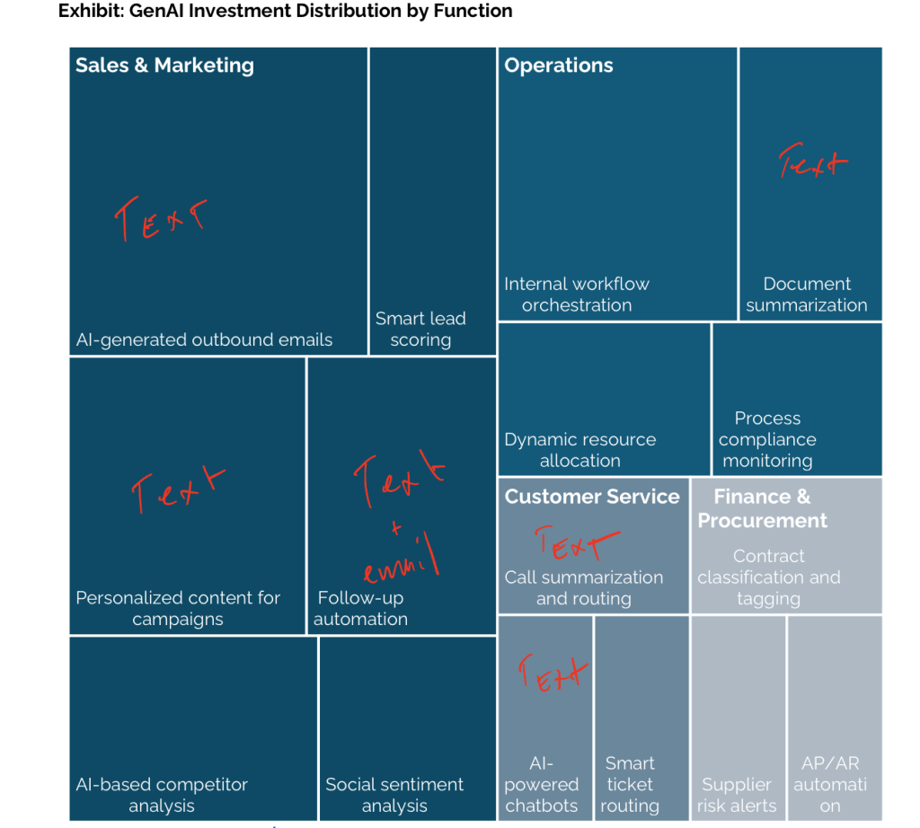 I lazily scratched out squares that are basically text-based tasks. The authors want you to take away the idea that there’s an over-abundance of Sales and Marketing pilots approved. My take away was closely tied to the point in 2. Above: execs probably aren’t the right people to look to for AI improvements. The first time you used ChatGPT, you too were probably amazed by the tool’s ability to generate lines of text effortlessly. “Hey I could use this to write emails!” or “This could write my marketing copy!” are probably the first 2 ideas that come across within 3 seconds of your first response. This low-hanging fruit approach to Gen AI pilots points to approvals by teams that haven’t done their homework to really think about AI’s potential for an organization. This was the best read-between-the-lines evidence of a poor survey population.